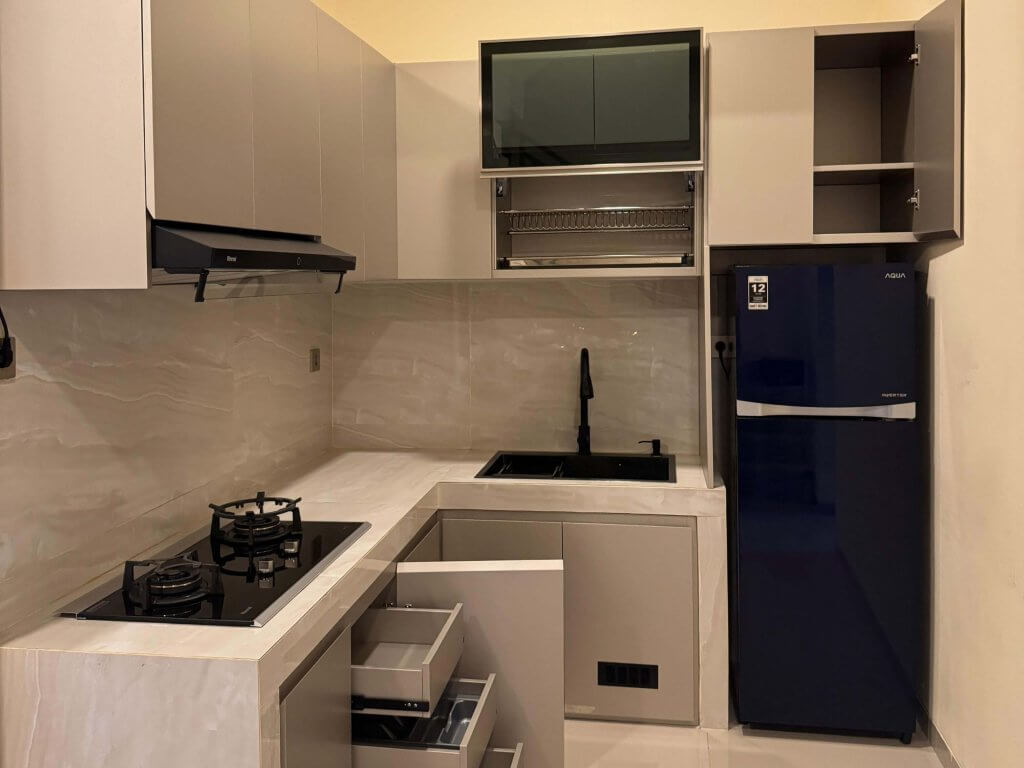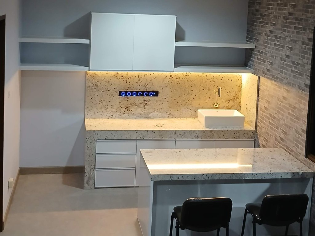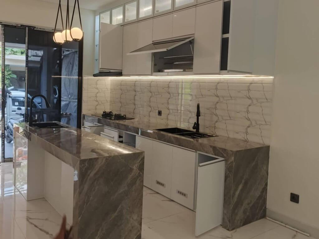 Kami melayani kitchen set untuk ruang dapur besar maupun kecil, bentuk L, U, atau single line. Finishing tersedia dalam berbagai warna dan motif: polos, motif kayu, motif marmer, hingga kaca aluminium kombinasi.
