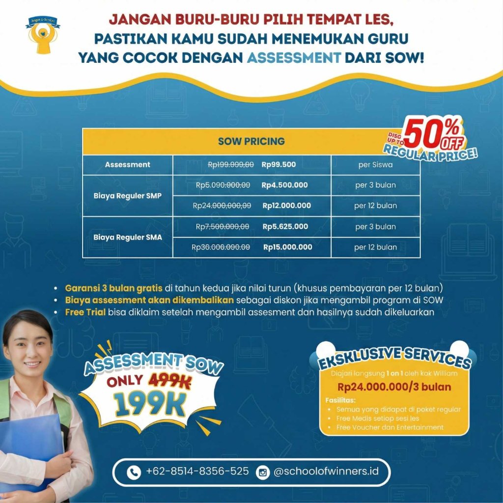 Jangan lewatkan kesempatan memahami gaya belajar anak dalam 30 menit dan mendapatkan rekomendasi metode belajar & profil guru yang paling cocok. Klik tombol WhatsApp di bawah ini untuk klaim harga promo khusus: